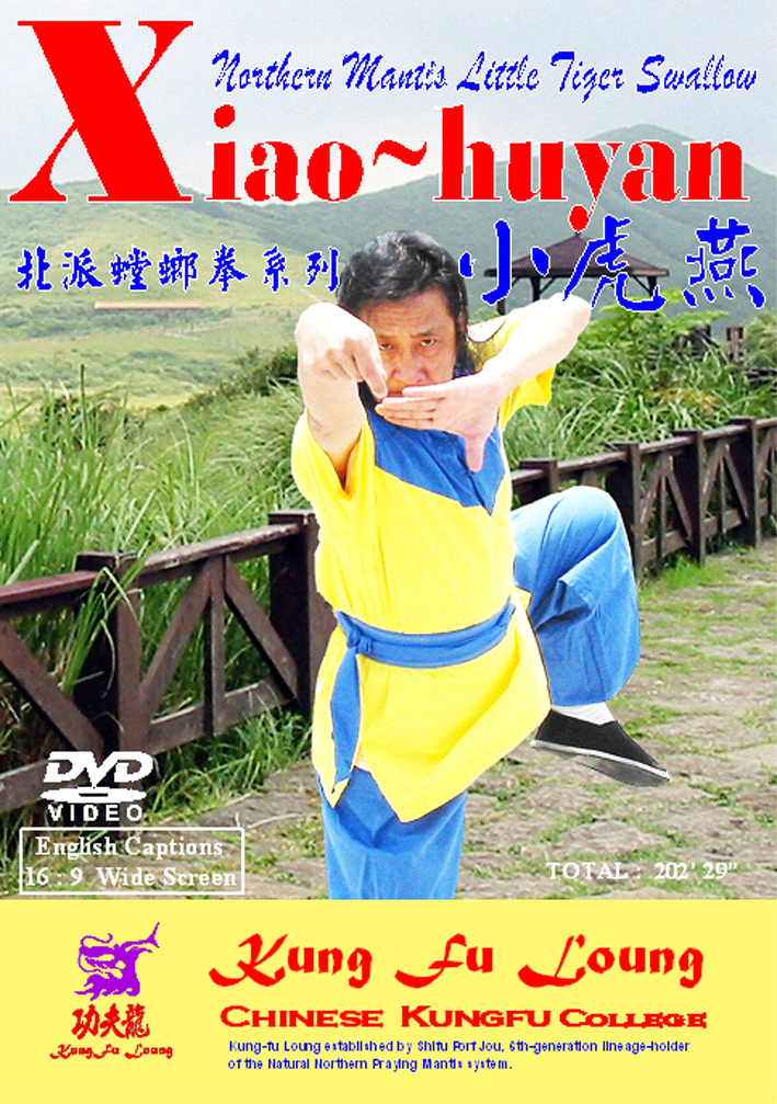 The Huyan (Tiger and Swallow) series of forms is one of the first sets to be practiced within Praying Mantis training. Of the Huyan forms, Xiao-huyan is considered most representative. As the name implies, Xiao-huyan combines the ferocity of a tiger with the lightness and agility of a swallow. This form has both hardness and softness and can be applied at long or short range. It is described as: move like a fierce tiger emerging from a thicket, land like a wild goose gently hovering to the ground. Hard and soft happen at the same time. Though this contradiction seems to be unnatural at first, This form actually flows extremely well. The hand techniques of Xiao-huyan are fast and highly applicable in combat. This is the first and most important form in the Huyan series.